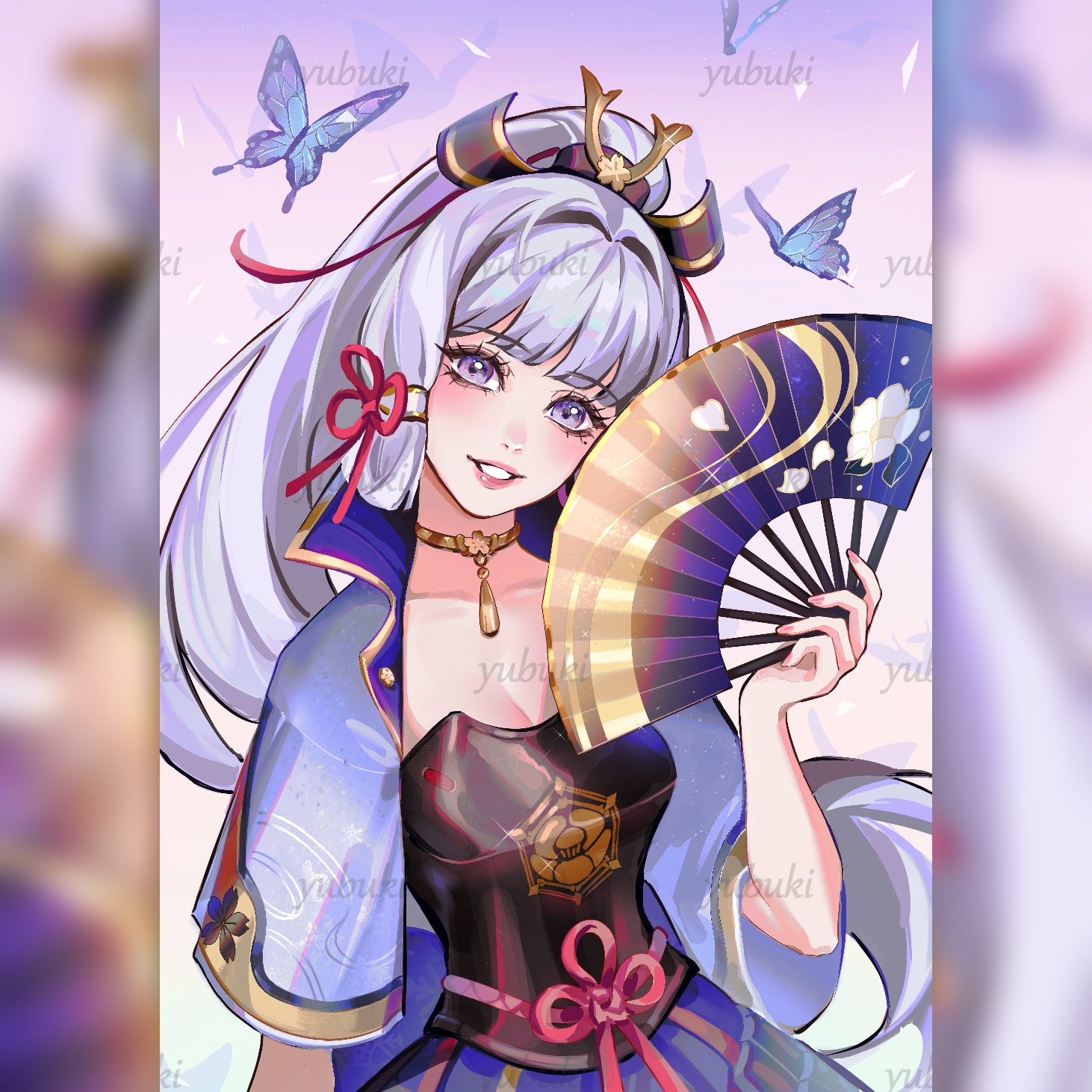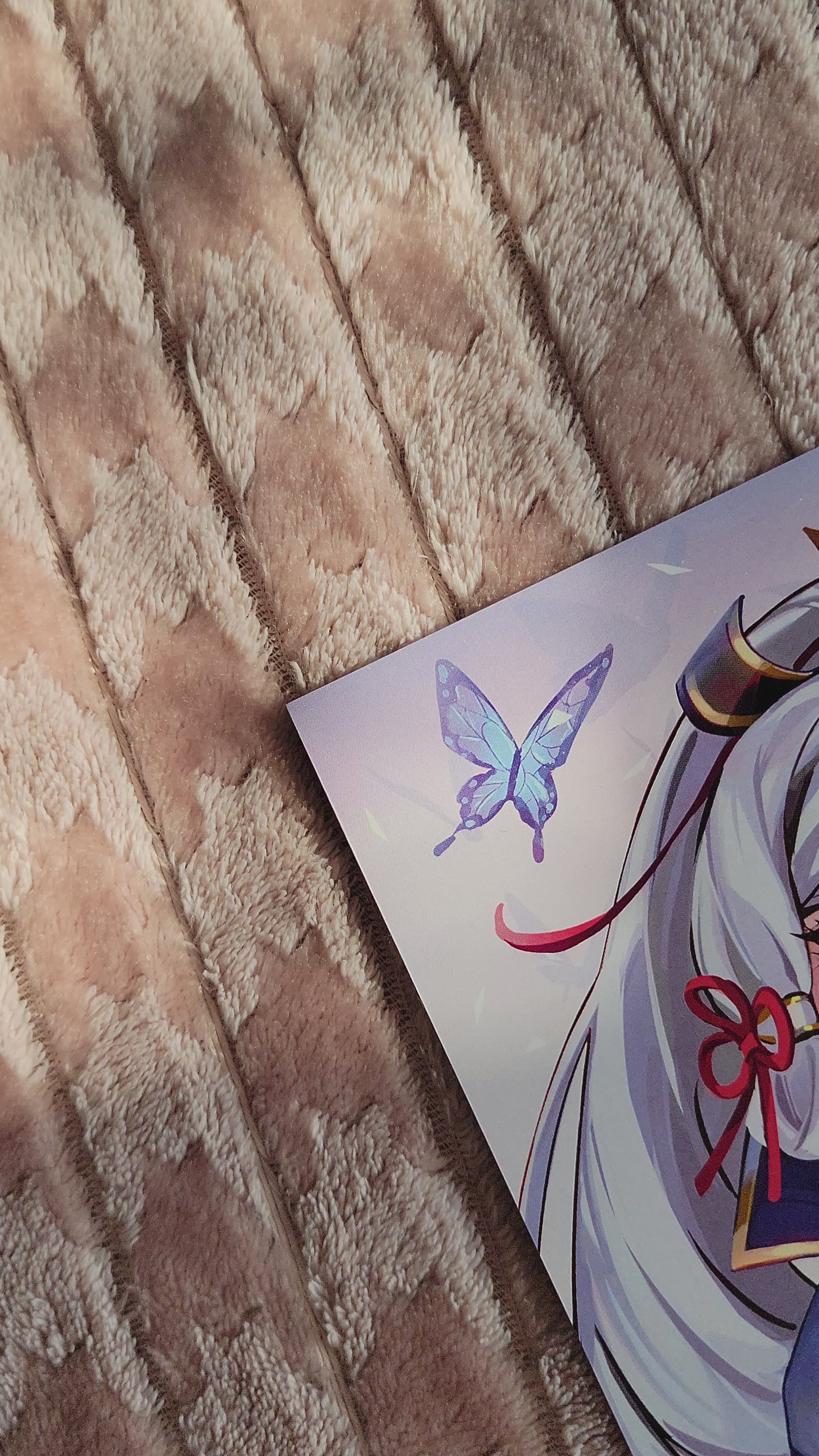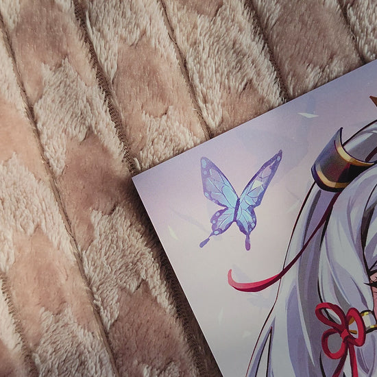 A mini print of artwork of the Cryo character Kamisato Ayaka from the video game Genshin Impact.